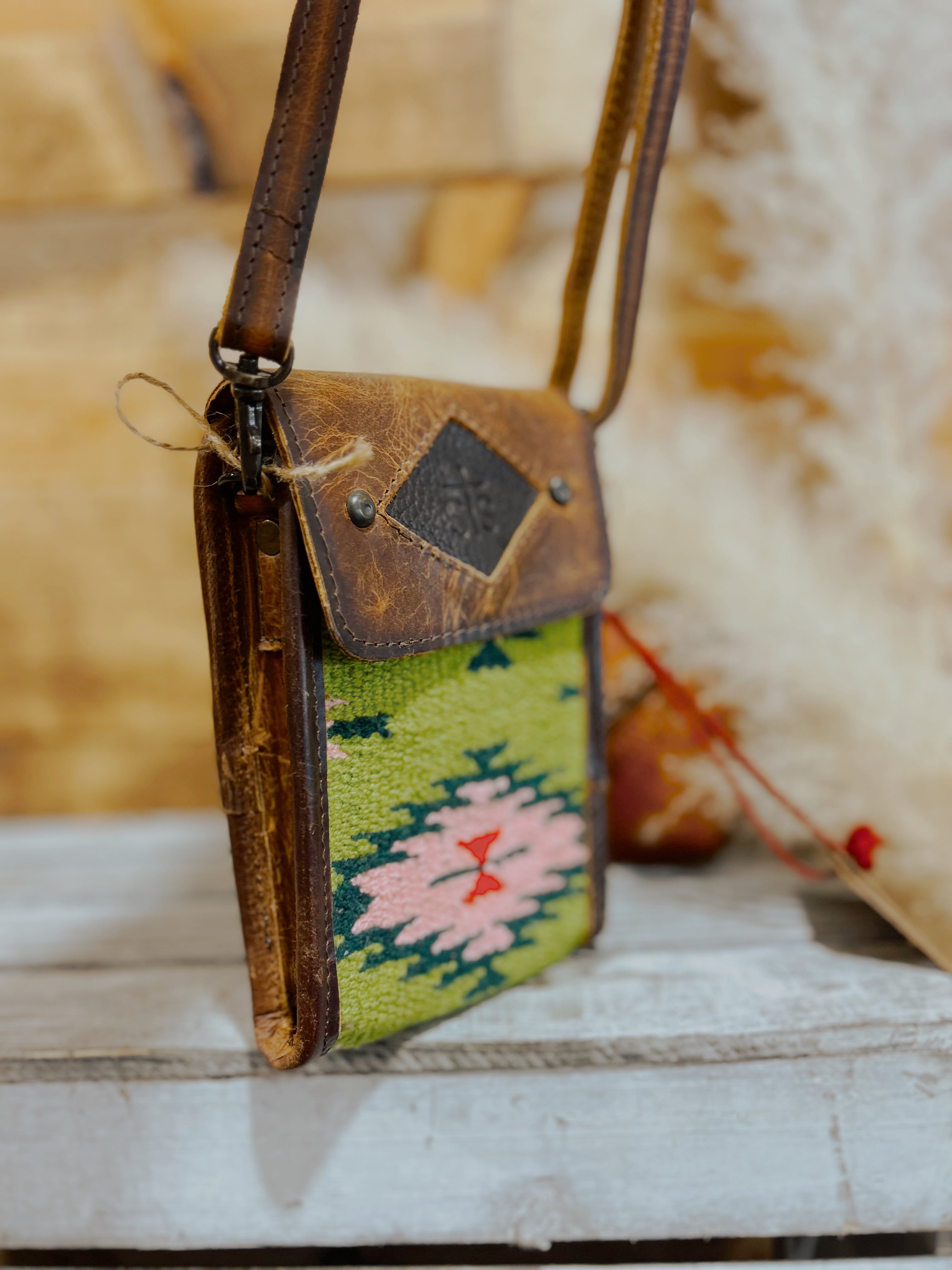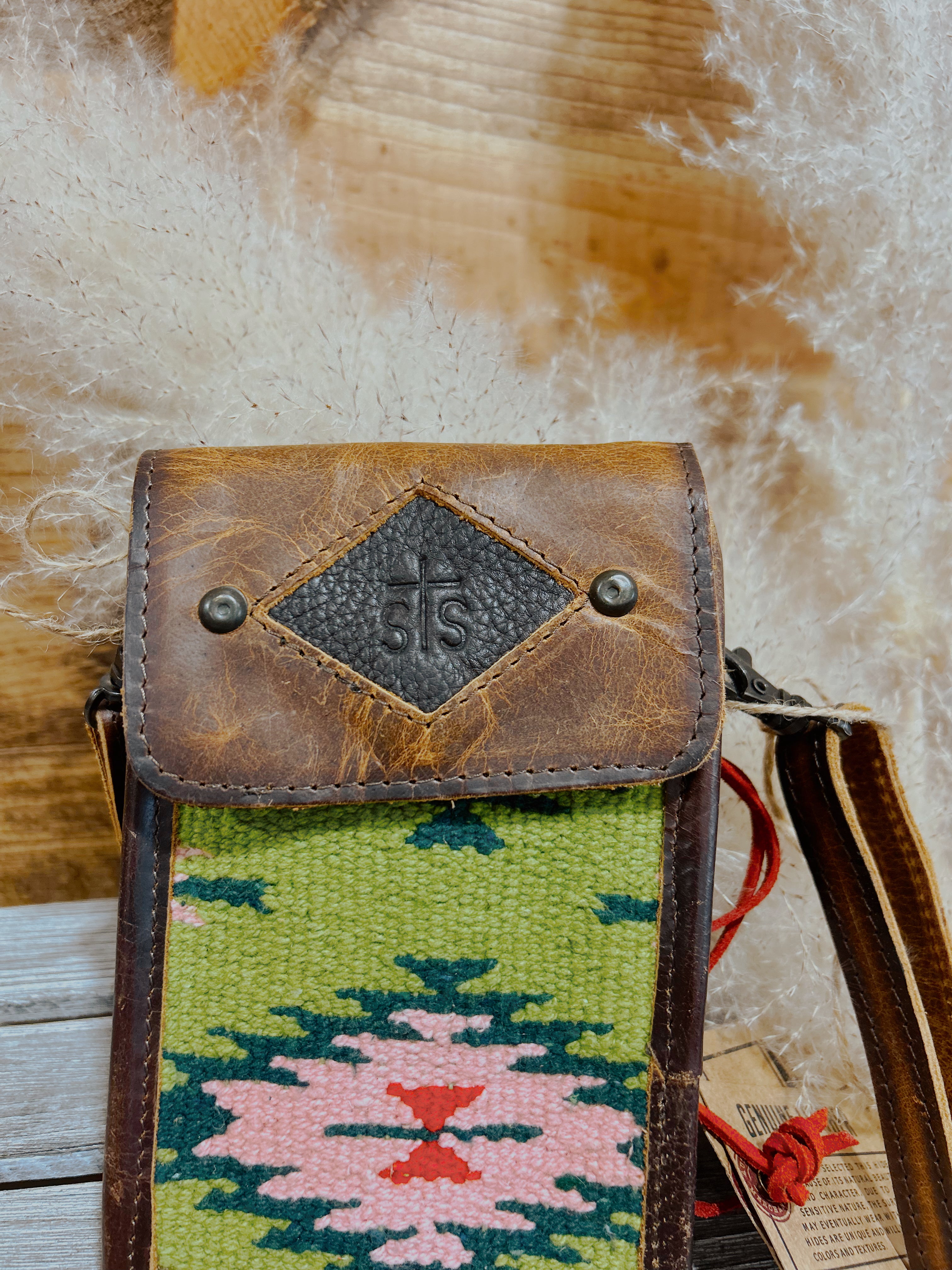 Chic Baja Dreams cell phone crossbody bag by STS Ranchwear. Genuine leather body, strap and fringe perfectly accent this cotton serape pattern bag. STS diamond patch logo on front. Snap closure. Measures: 6.5 x 4 x 1"