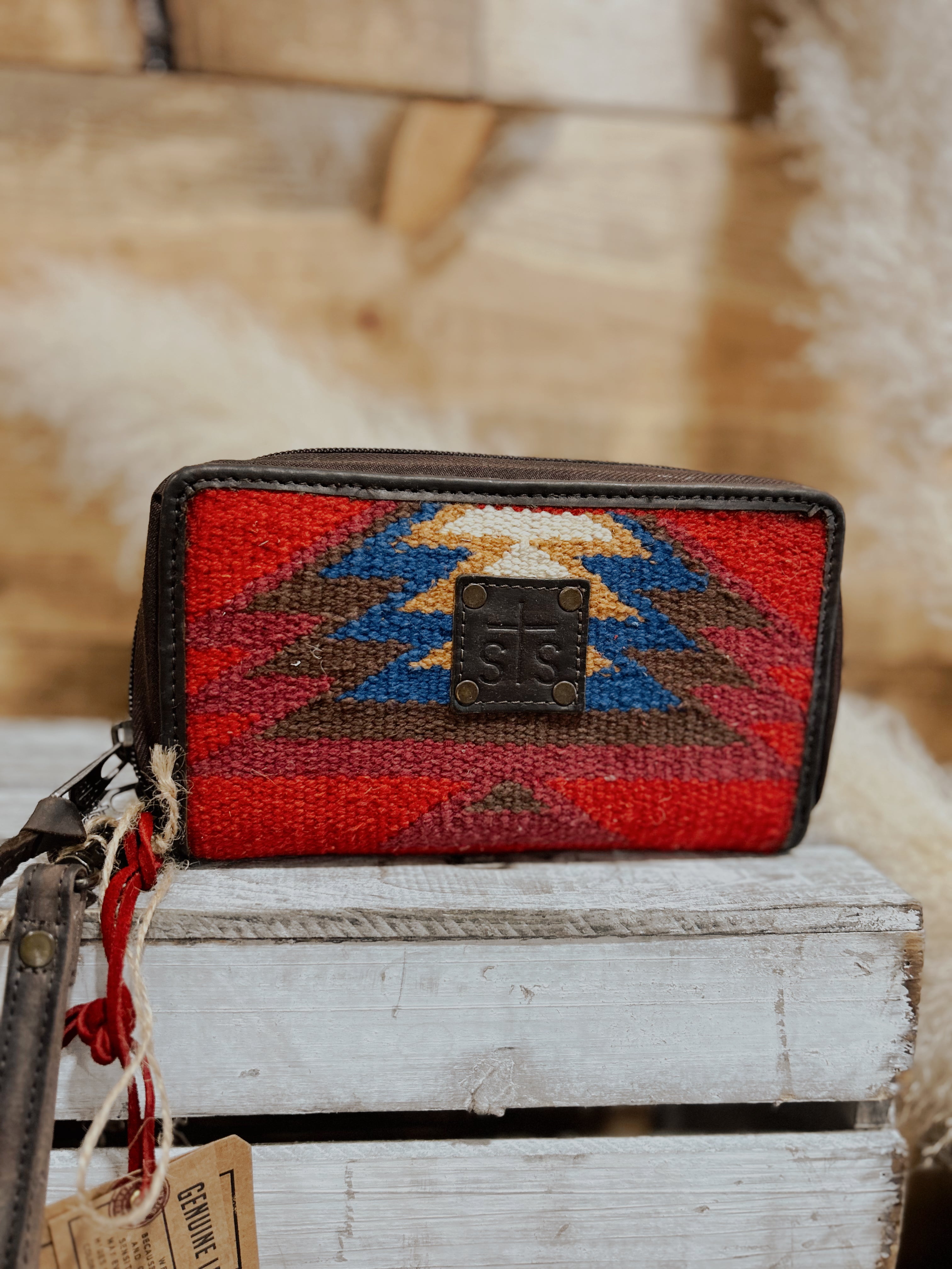The Crimson Sun is the perfect combination of crimson red serape and matte-natural chocolate full grain leather. The Kacy Organizer features ombré, Aztec pattern unique to the shape of the wallet.