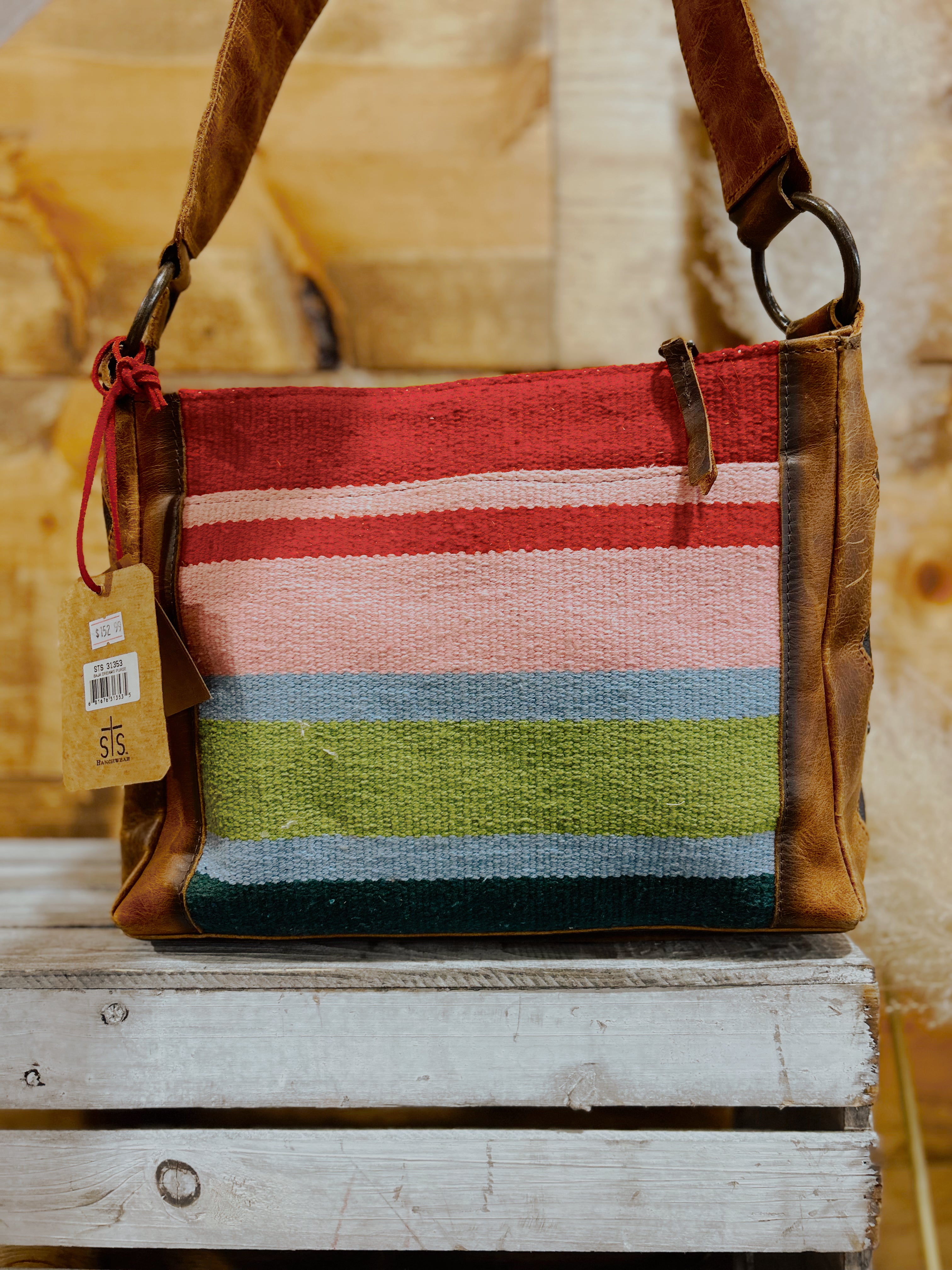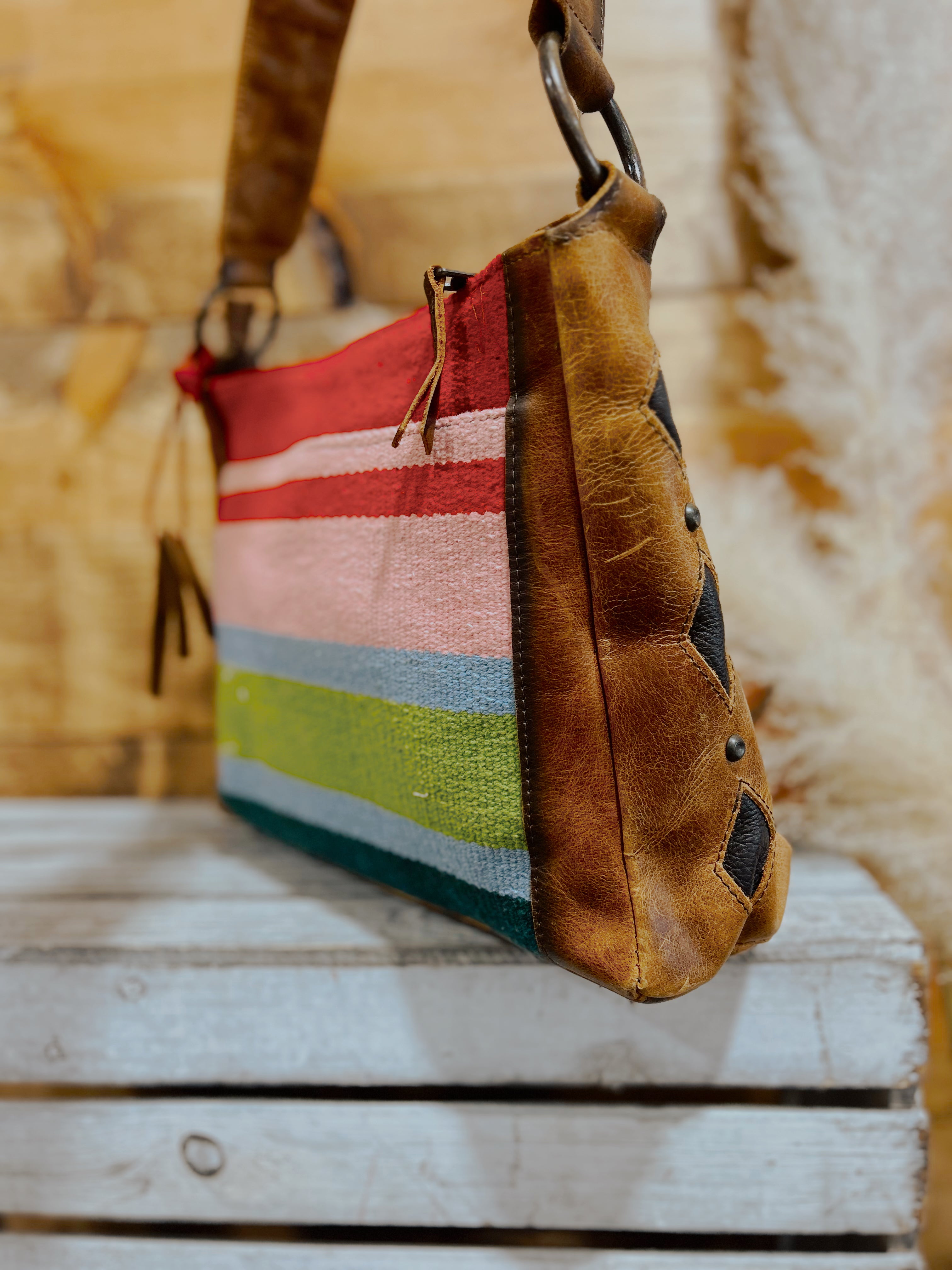 Inspired by the color of the year and nature's greenery, this collection combines tones of the teal, red and pink accents along a rustic full grain tanned leather for a handbag that is sure to turn heads.
