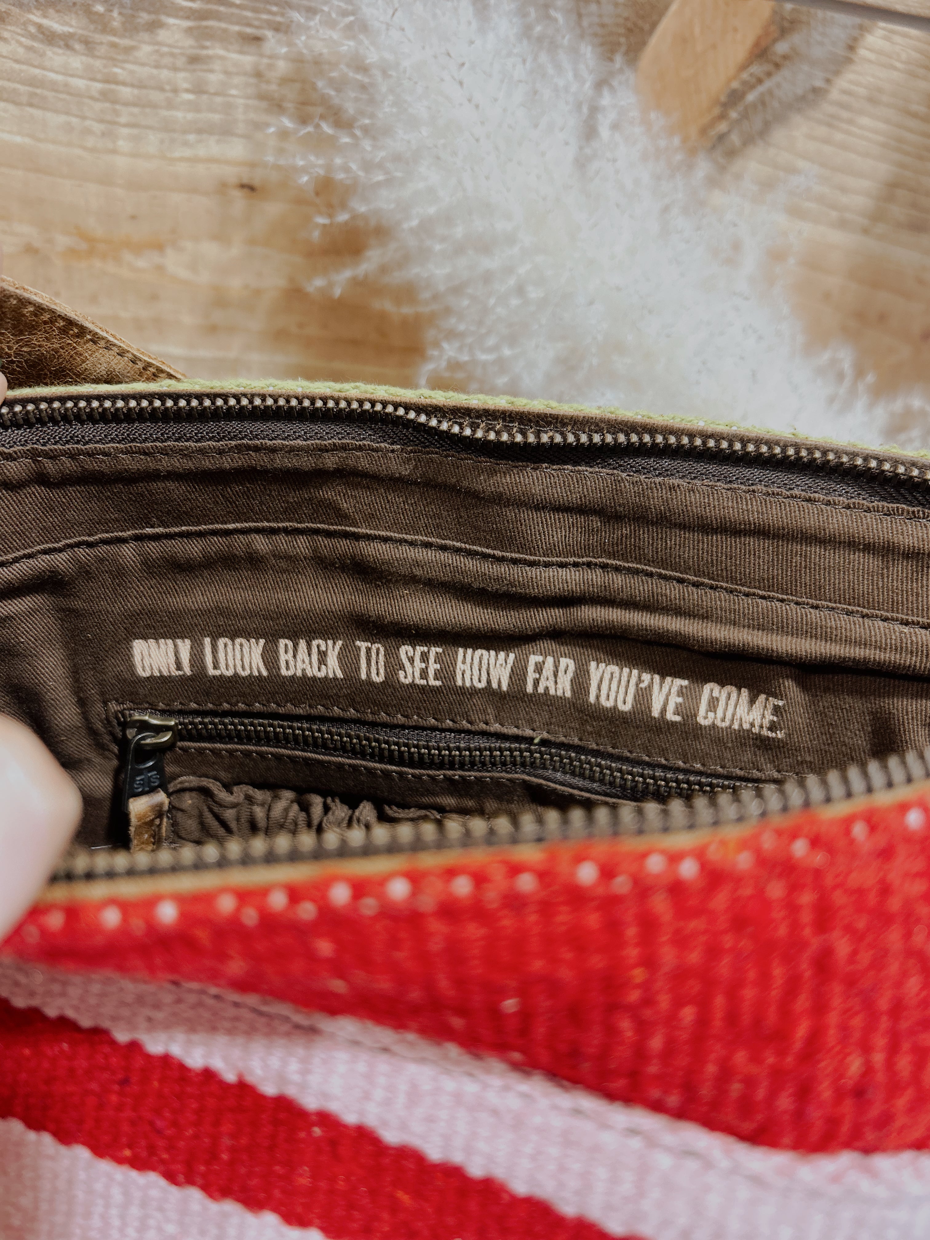 • 1 interior keychain clasp; "only look back to see how far you've come" quote inside