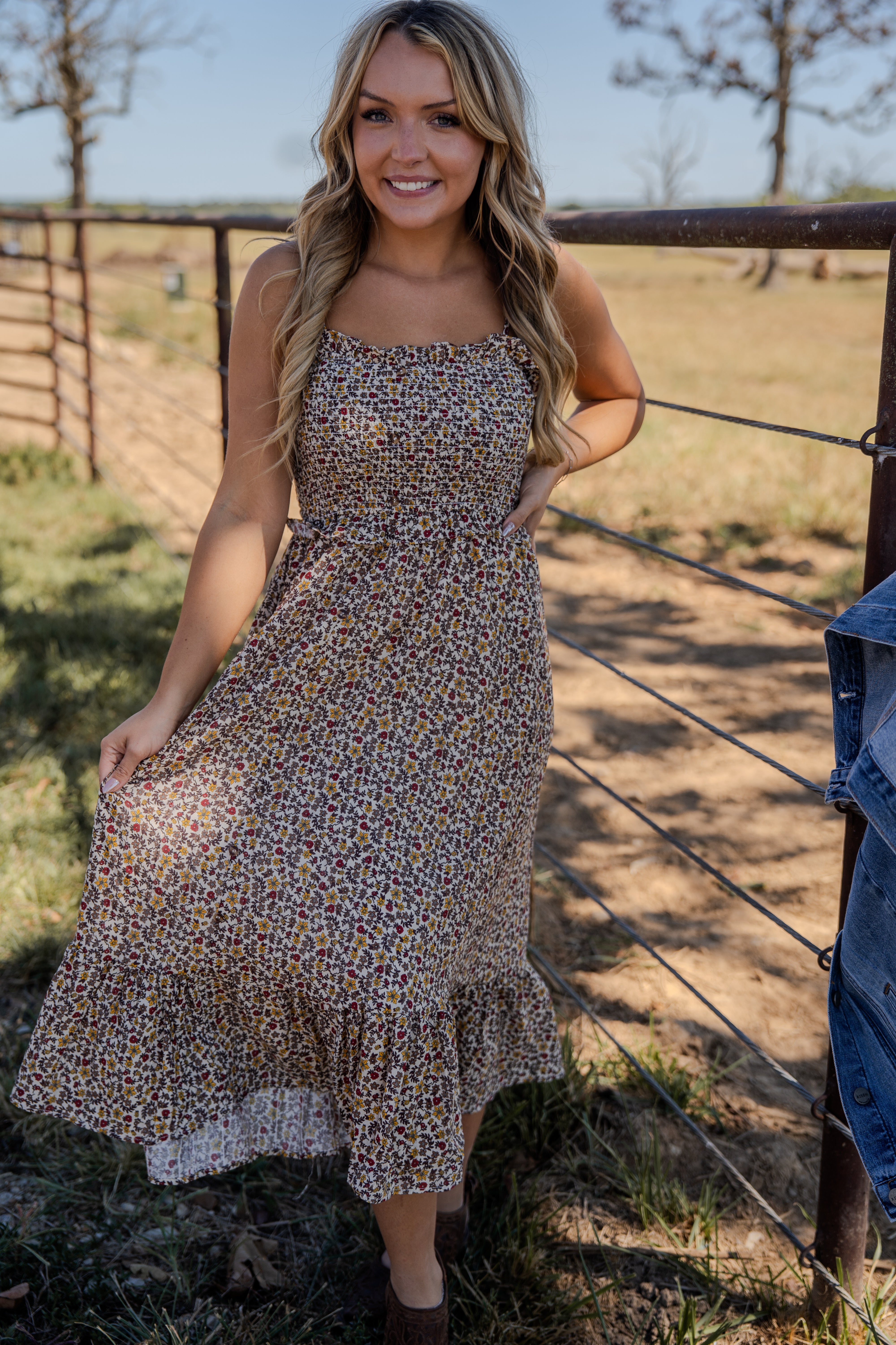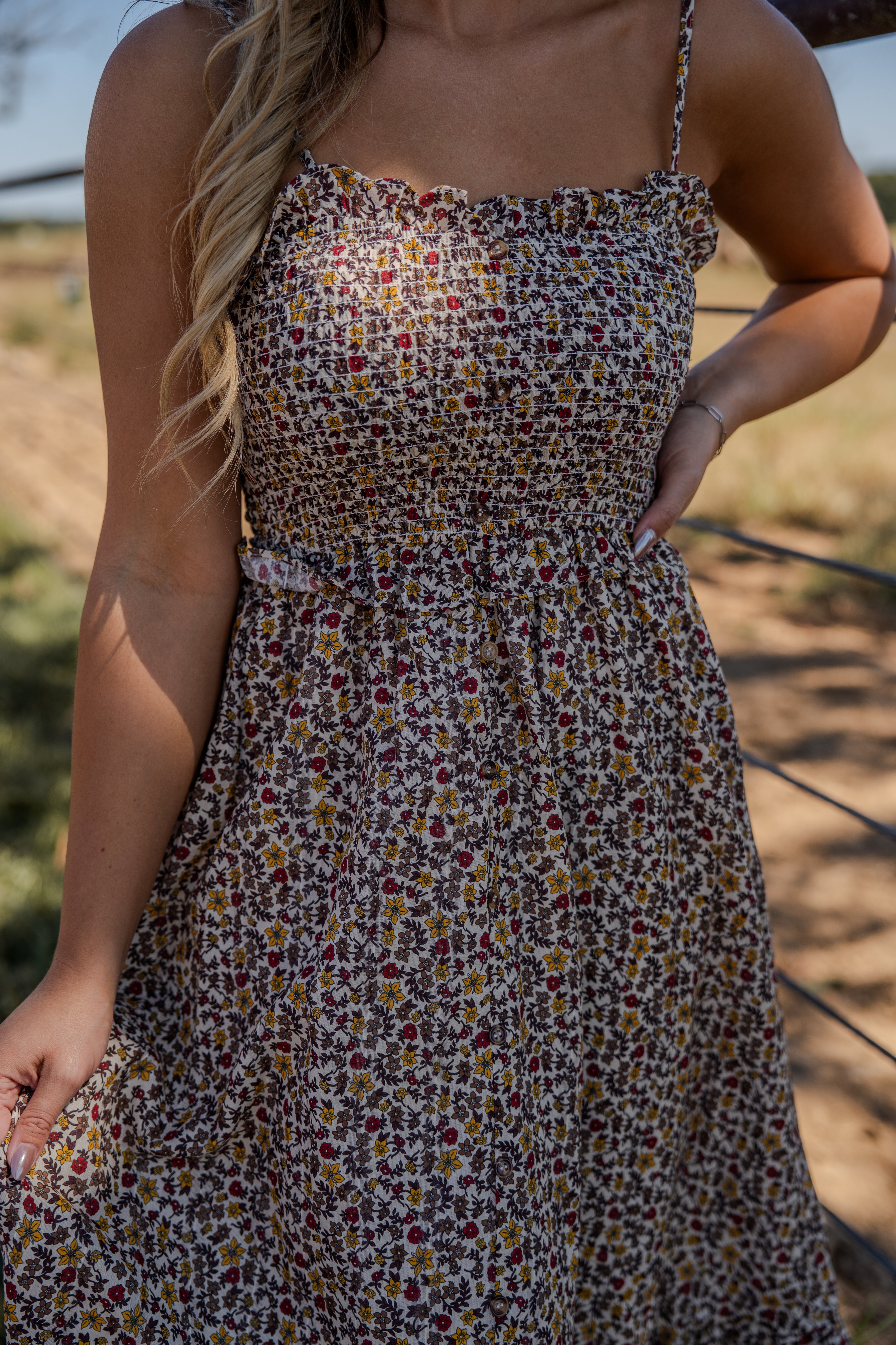 An out of the norm color combo on this floral print dress makes it stand out in the best way possible!