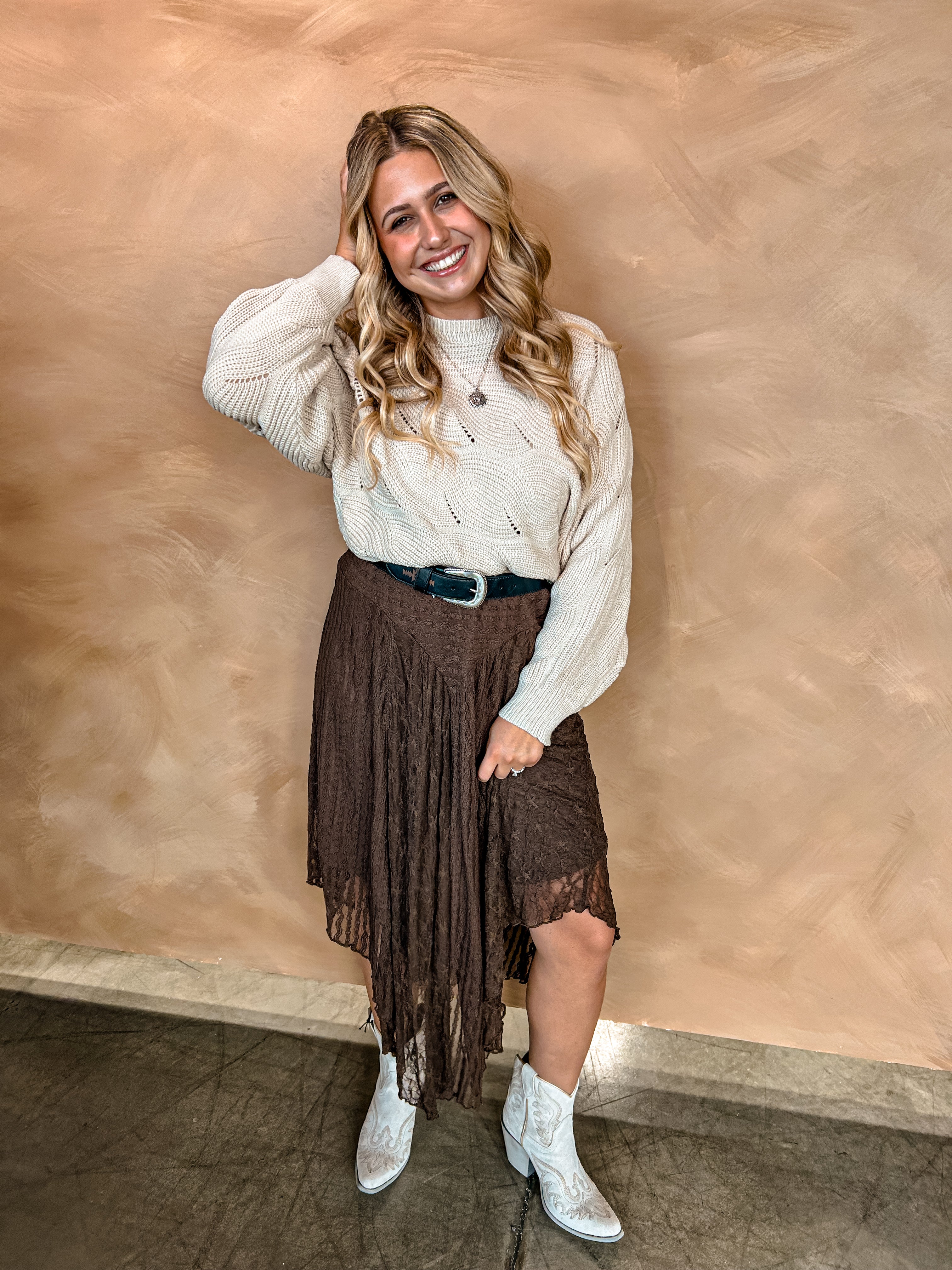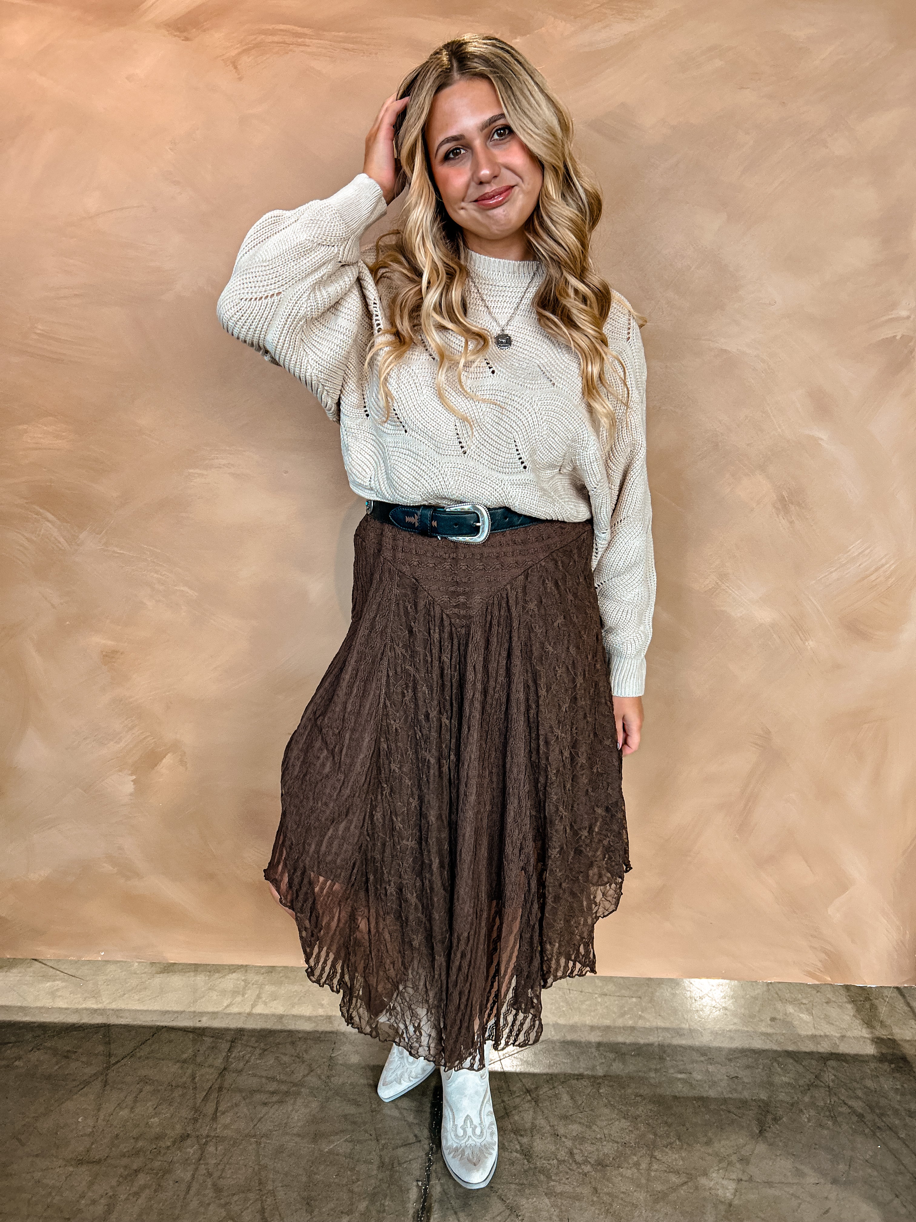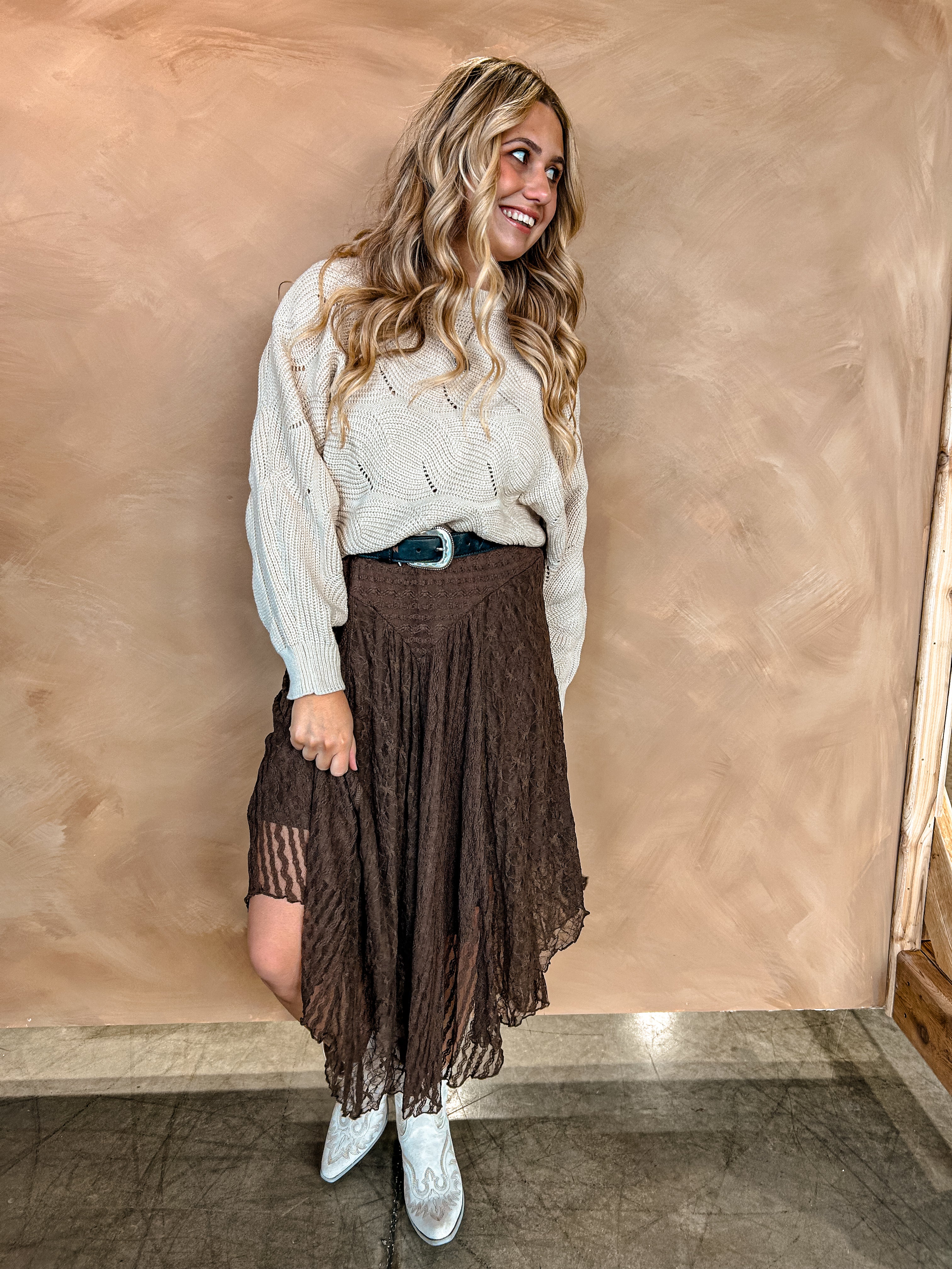 Trendy and classic, this skirt features a gorgeous brown lace with a curved hem!