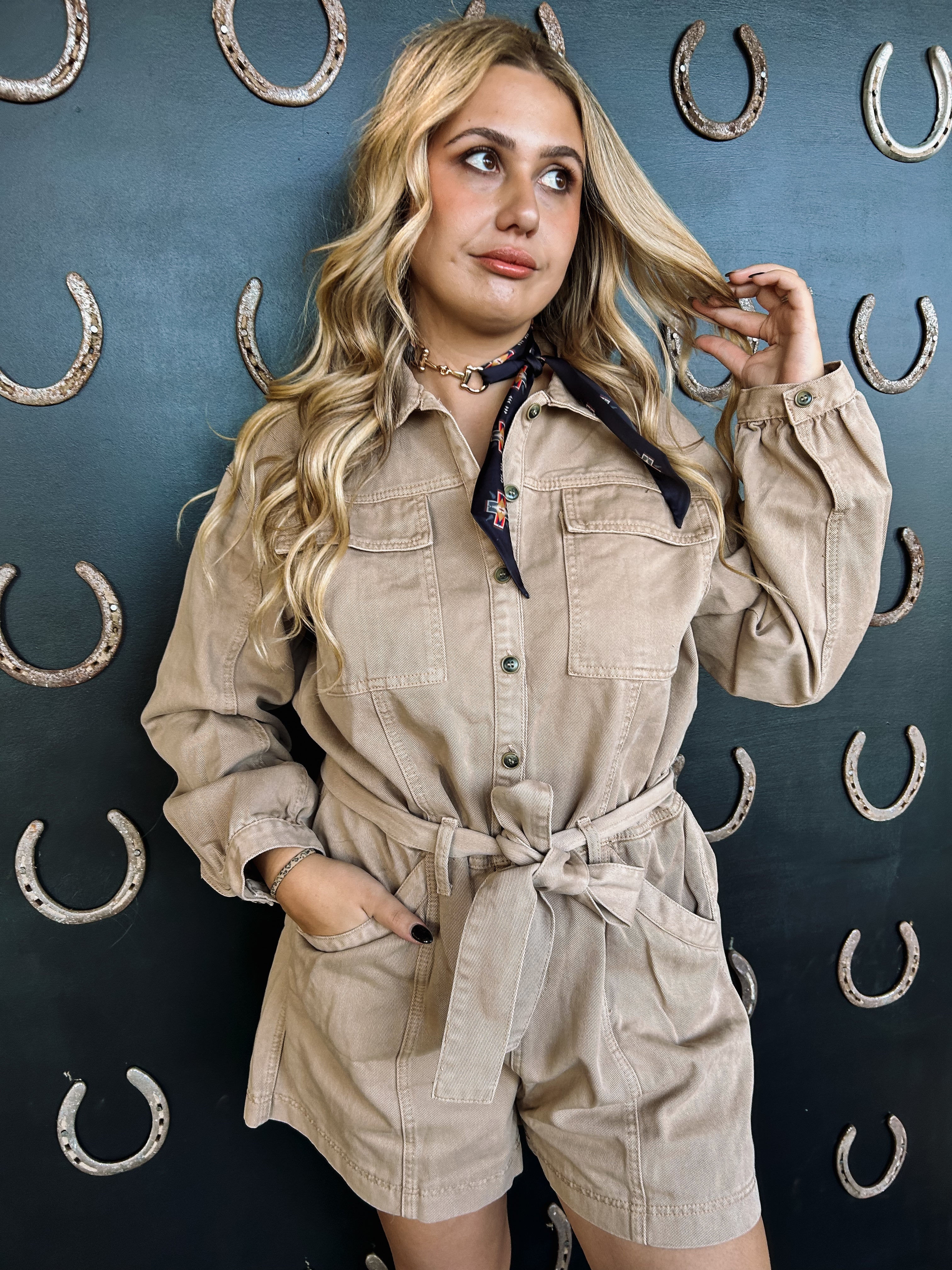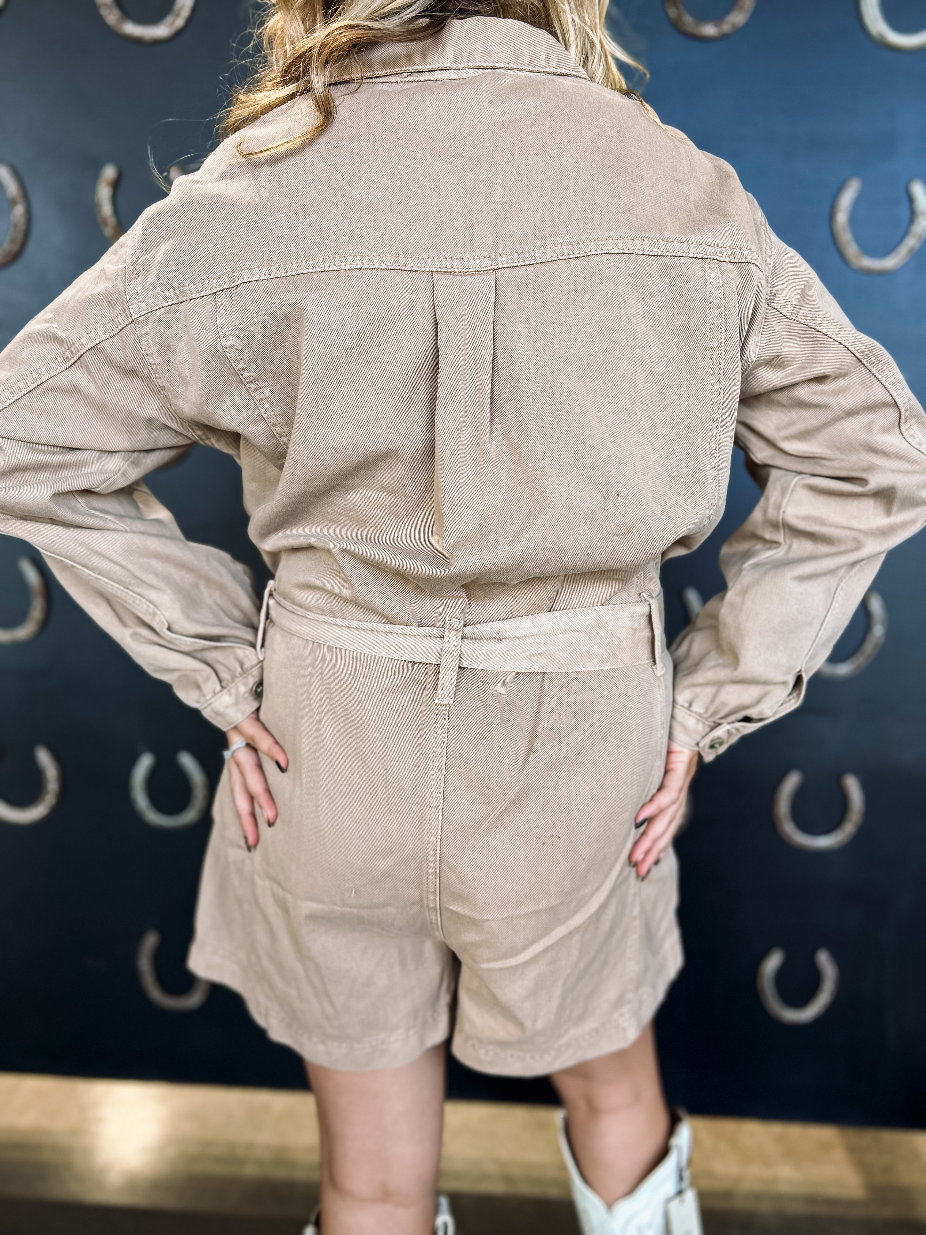 - Engineer inspired woven romper - Collar with button closure on center front - Flap pouch pocket on bust - Belt loop with strap tie - Side pockets on bottom pants