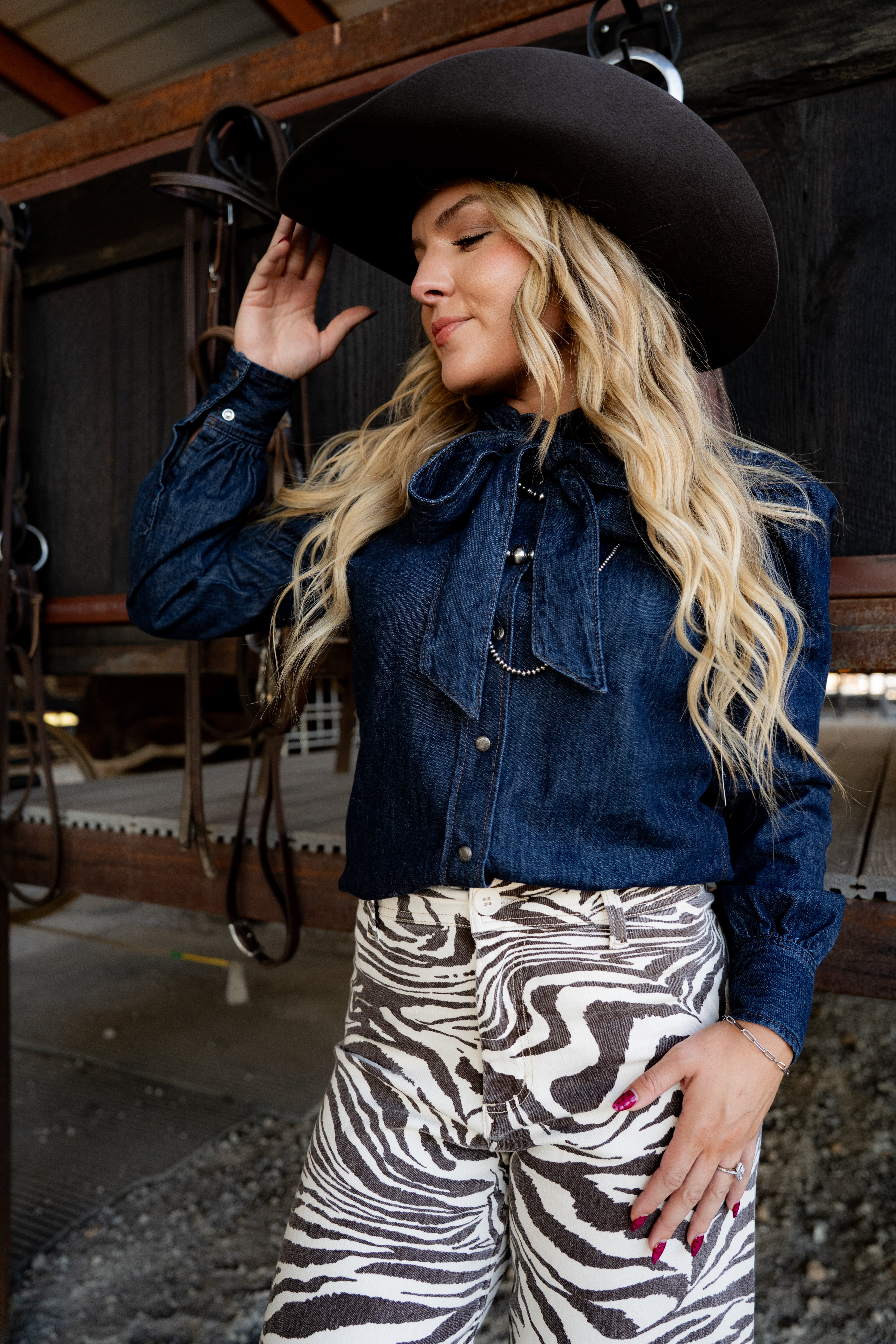 Chic and polished, this is the denim shirt reimagined. Unexpected details—like puff sleeves and an on-trend bow collar—lend a feminine elegance to the classic cowboy staple.