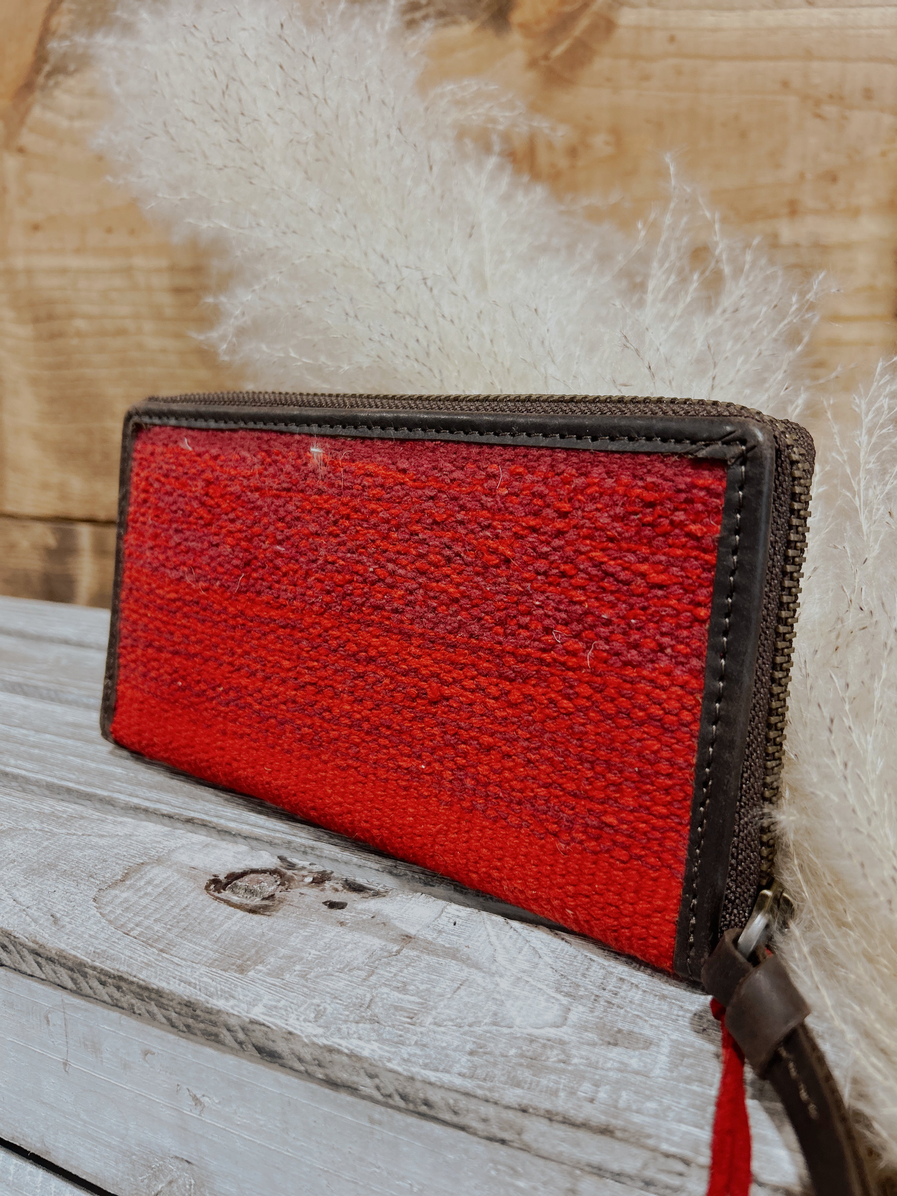The Crimson Sun is the perfect combination of crimson red serape and matte-natural chocolate full grain leather. The Bifold Wallet contains ombré, Aztec pattern unique to the shape of the wallet.
