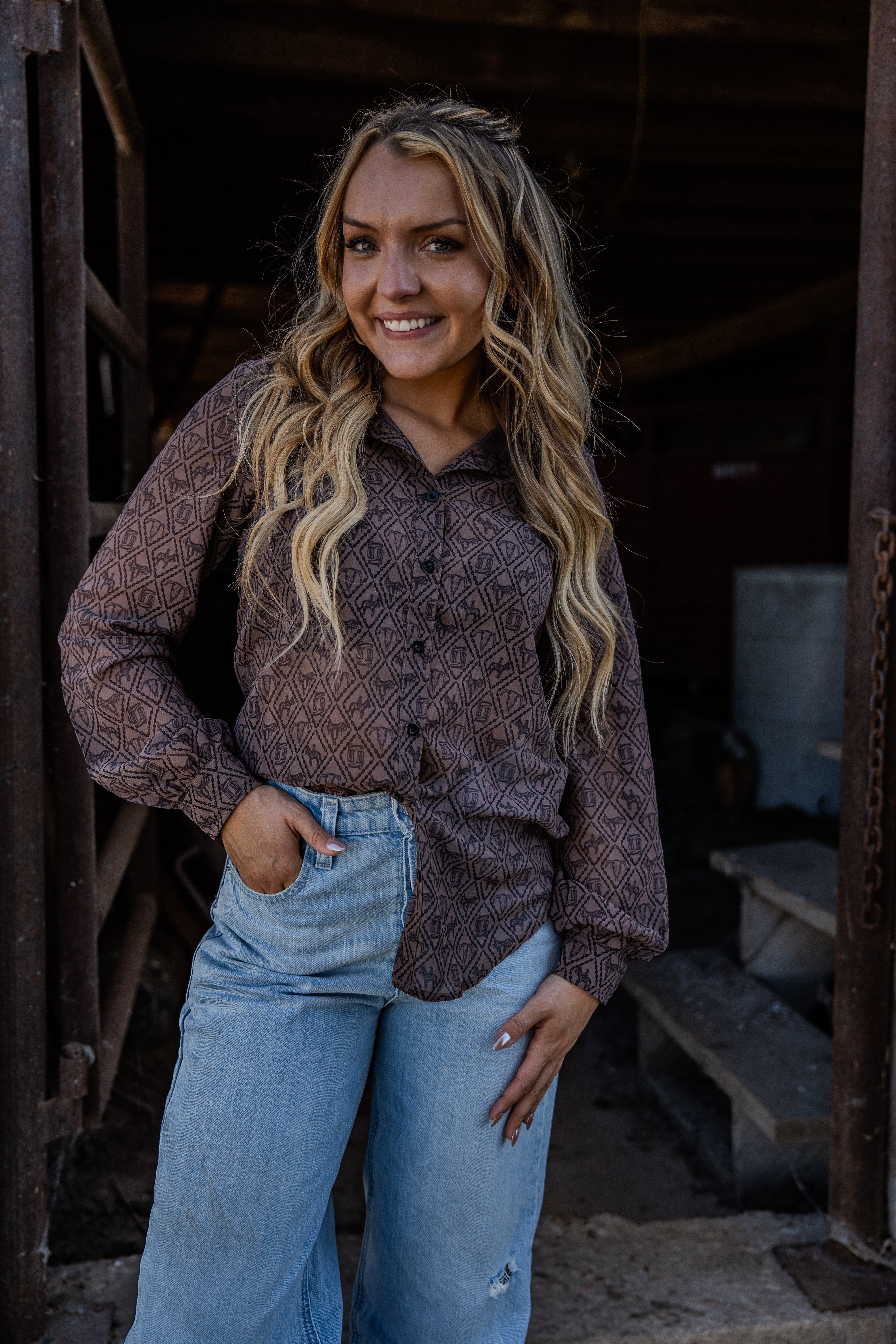 This top screams corporate cowgirl - think of all the fun possibilities this top has!