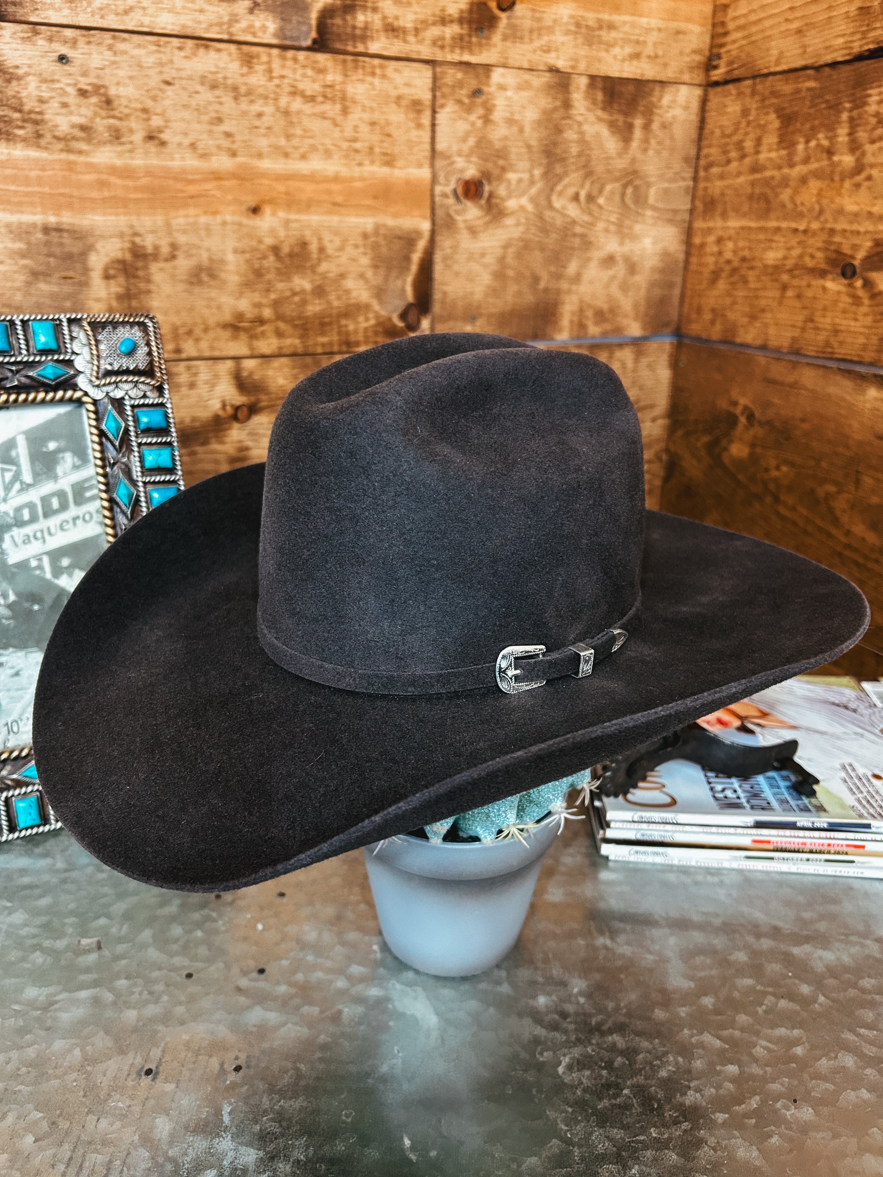 The McQ is a 4X Angora blend Western hat with a 4.5" rodeo crown. The McQ is a sleek hat and features a simple self-felt hat band and buckle set!