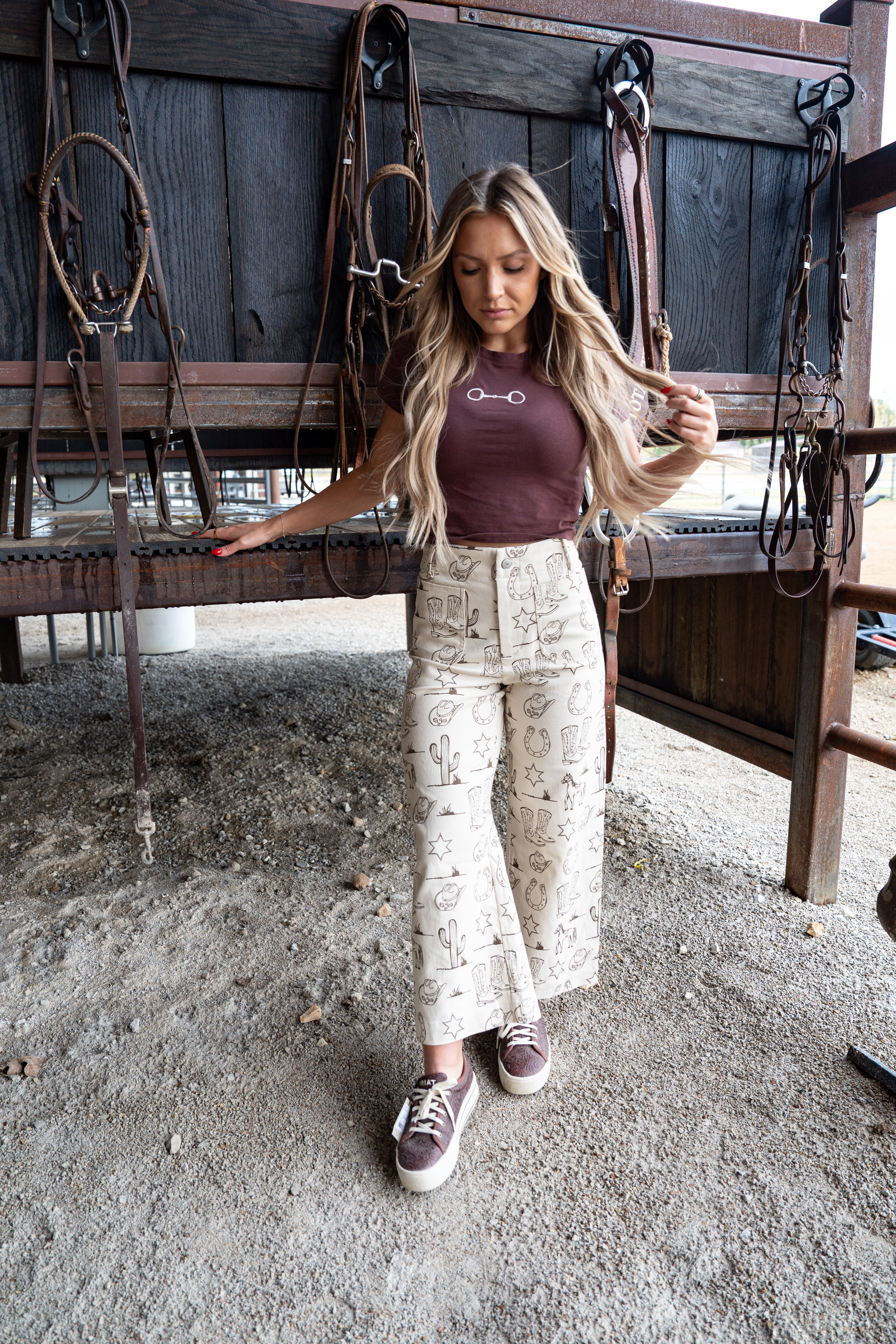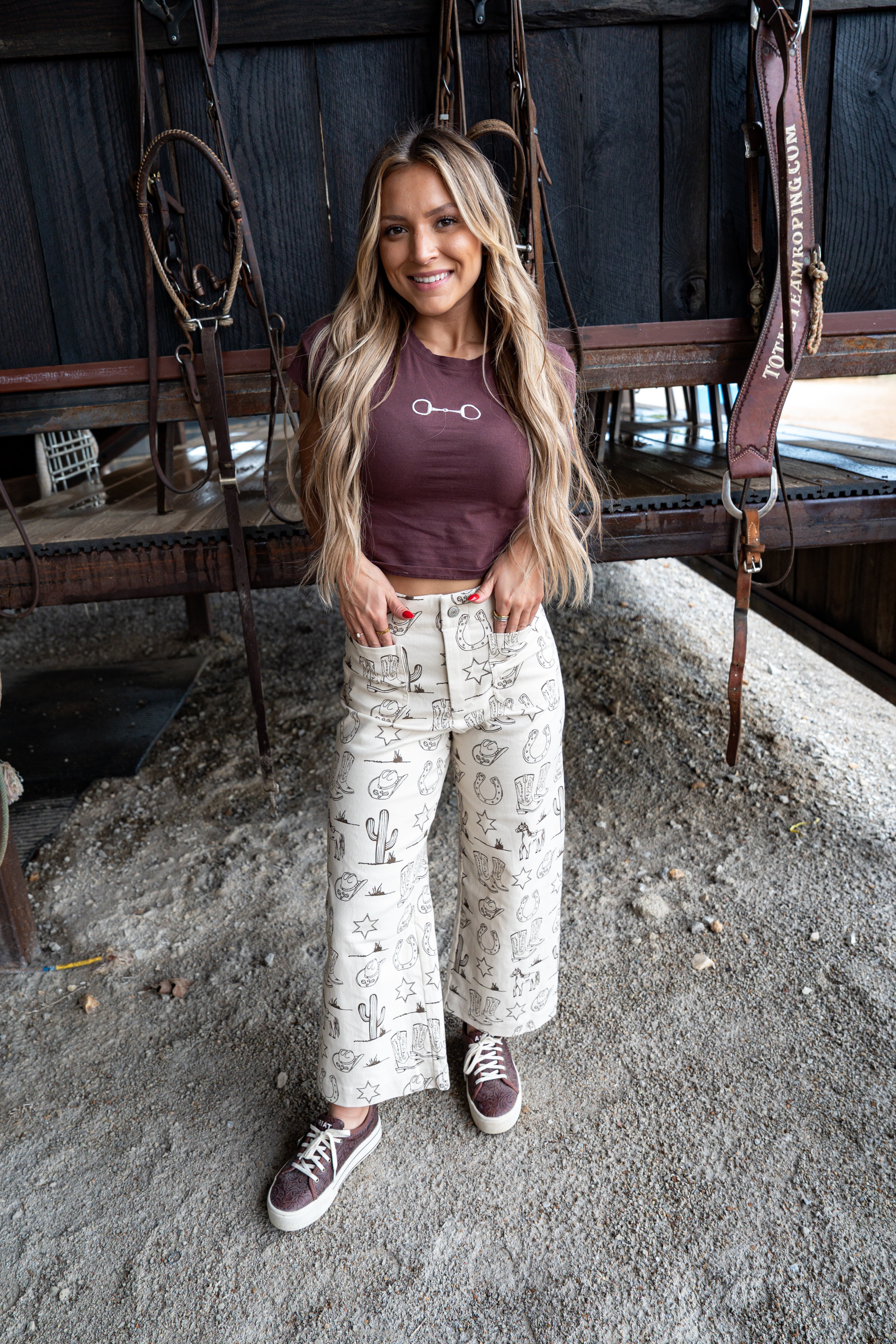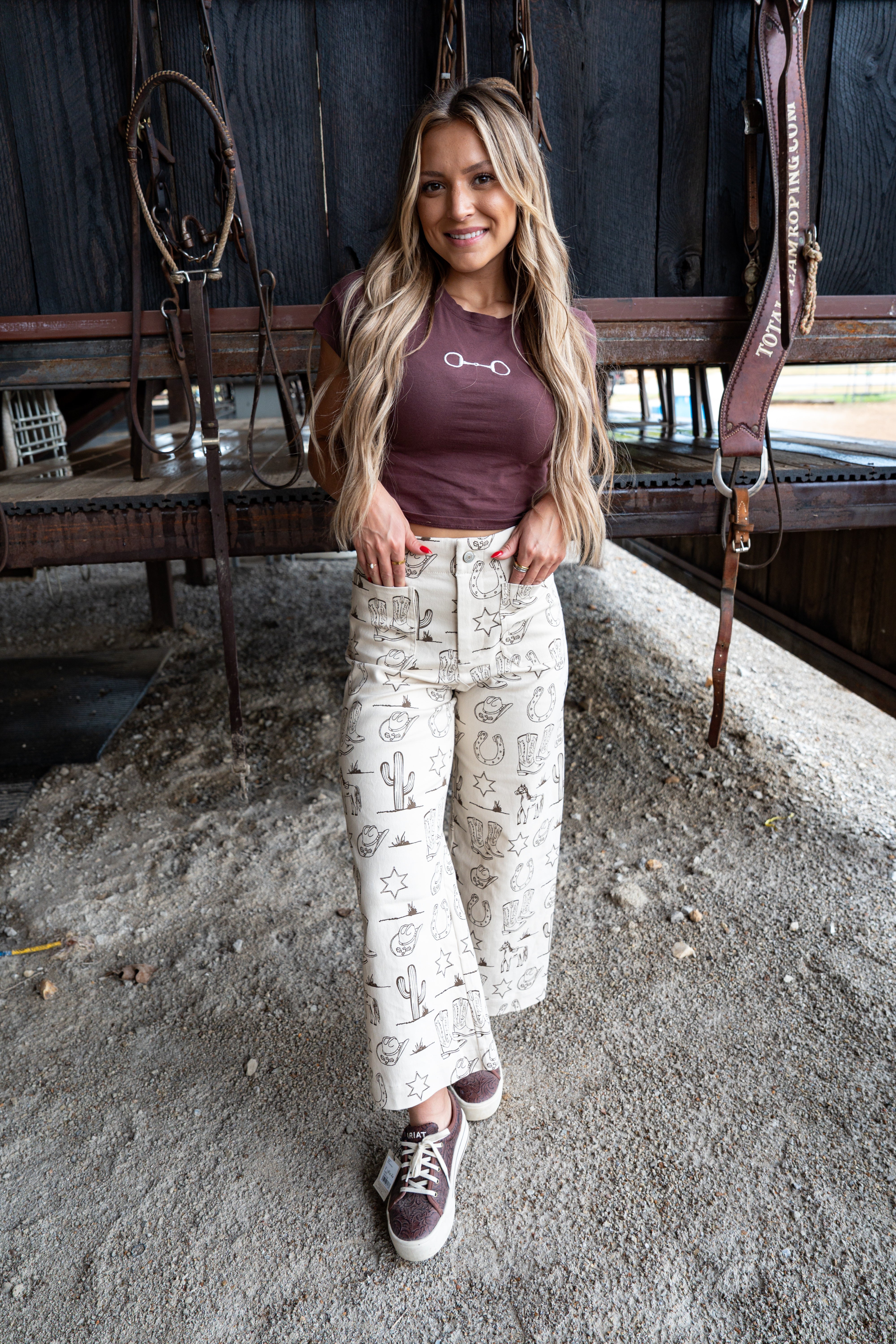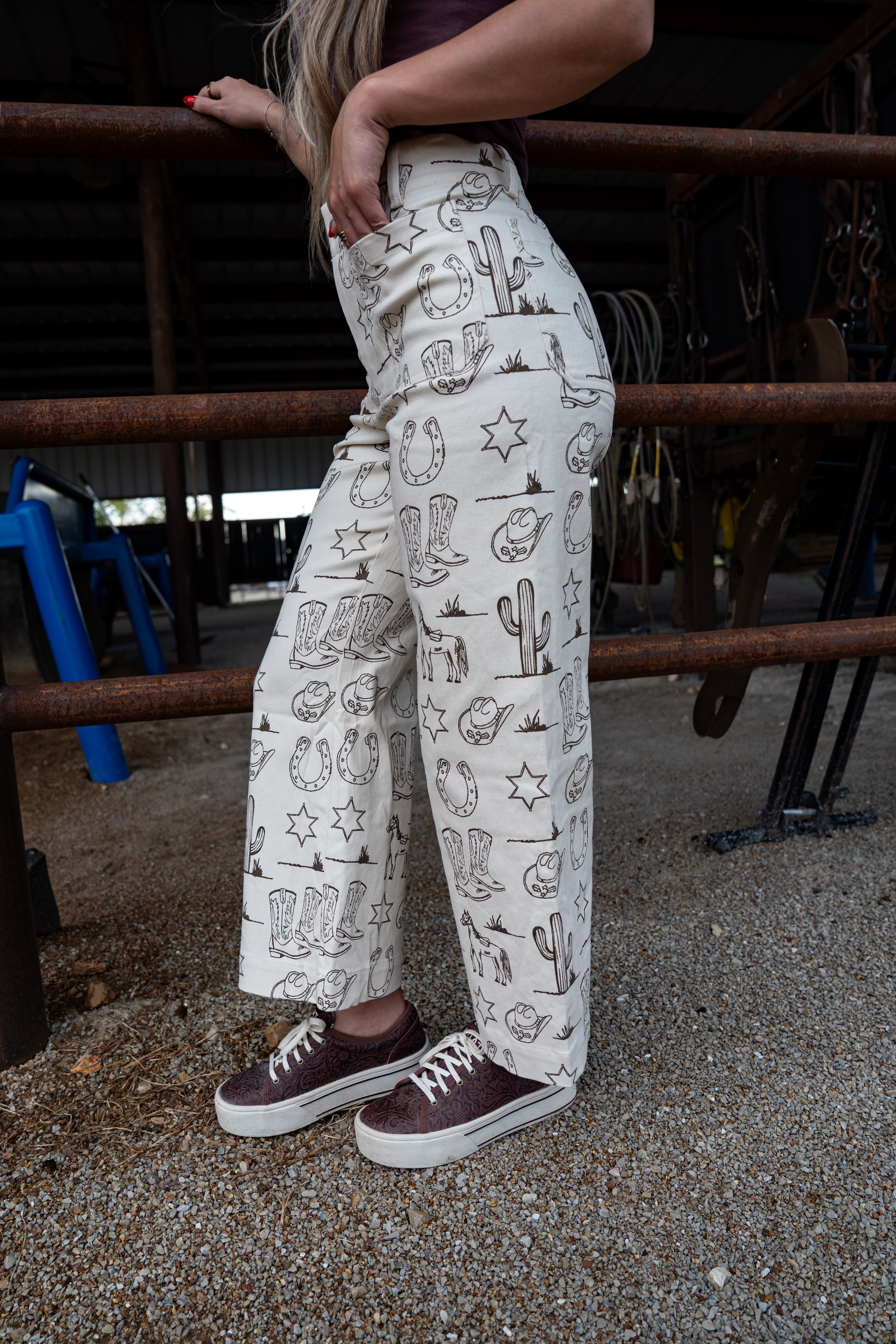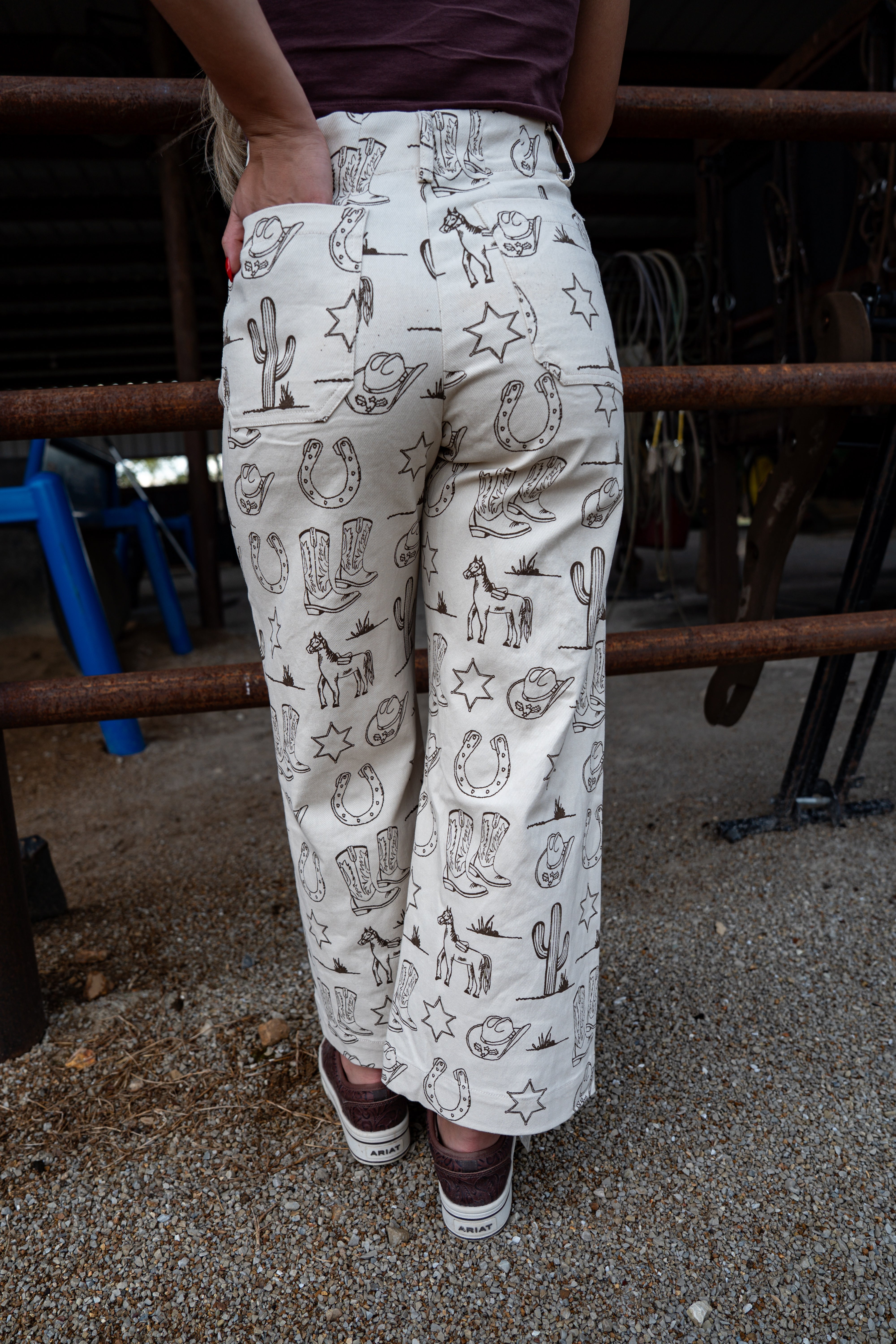 Make a statement in the Out West Pants! Featuring western prints on cream canvas, they are sure to make you stand out!